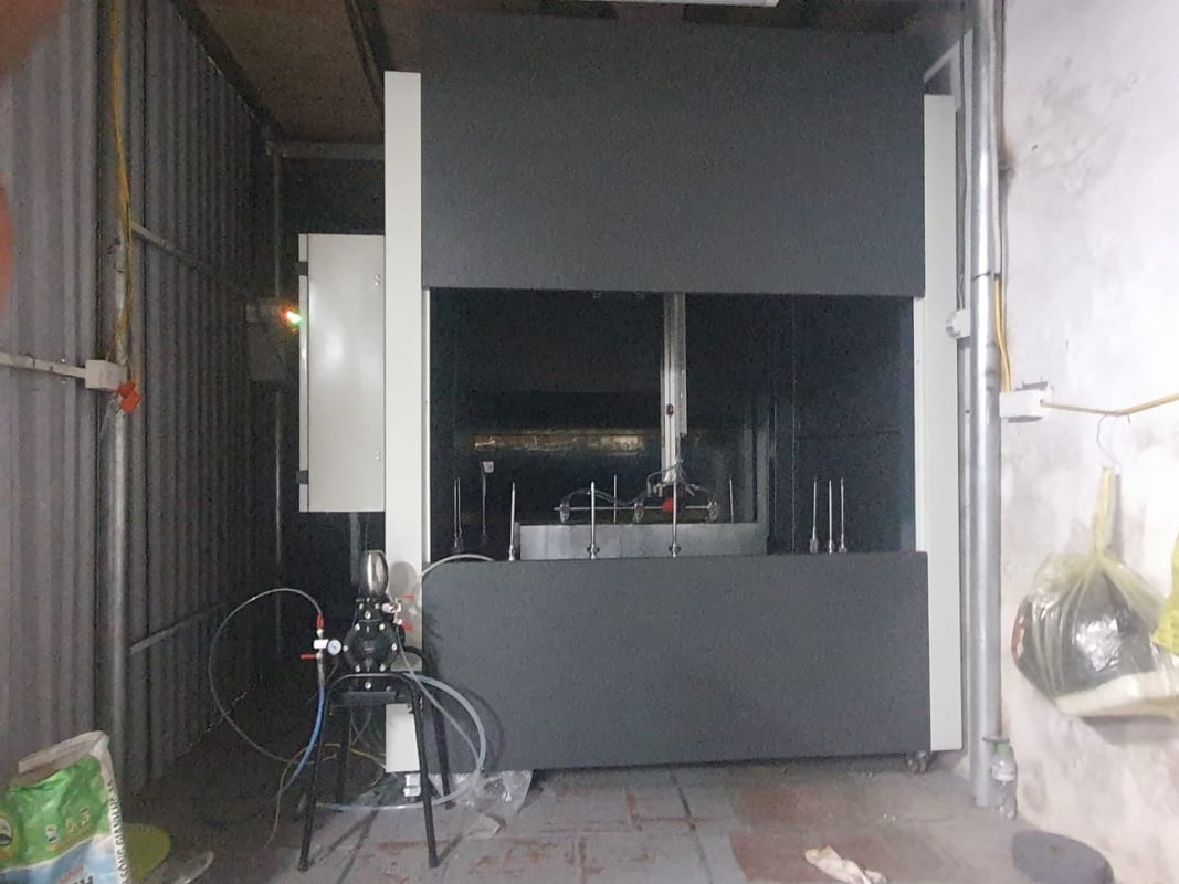 Loại máy phun sơn tự động này do Hùng Vương CNC sản xuất phù hợp với các cơ sở làng nghề sản xuất đồ thờ, đồ tết, đồ sinh nhật…. Hai máy sơn được khách hàng tại Thường Tín Hà Nội ứng dụng sơn chi tiết nhôm màu ánh đồng.