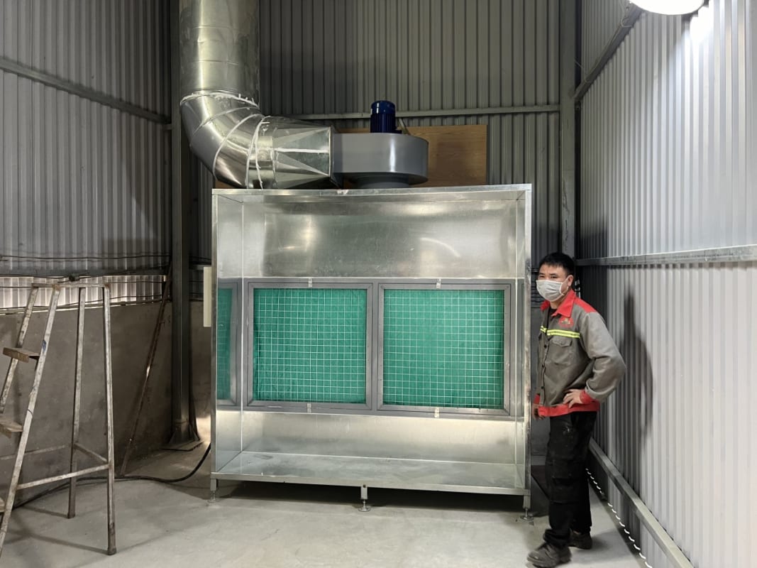 - Buồng thu bụi sơn khô sử dụng tấm lọc sơn sọi thủy tinh công nghiệp 3 lớp để ngăn cản bụi sơn được thải ra môi trường bên ngoài, bụi sơn sẽ ở lại tấm lọc