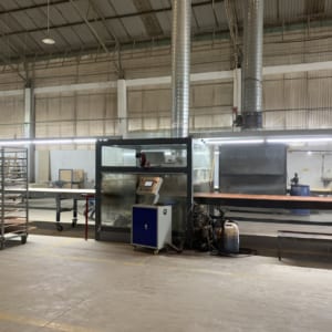 - Máy bao gồm buồng phun sơn , băng tải cấp phôi, hệ thống dập bụi sơn màng nước